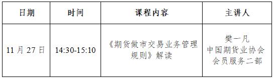 《期貨做市交易業務管理規則》(以下簡稱《做市規則》)將于12月1日起實施。為幫助期貨公司及風險管理公司相關人員更加全面準確理解《做市規則》,確保規定有效執行,協會將于11月27日舉辦《做市規則》解讀直播培訓。現將培訓相關事項通知如下: