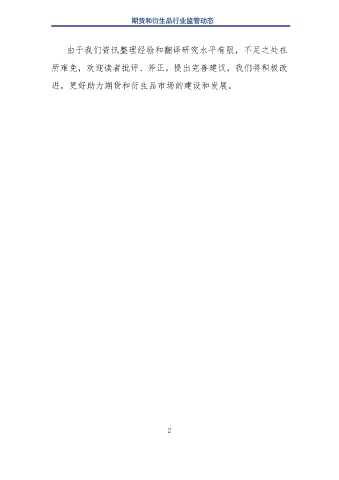 期貨和衍生品行業(yè)監(jiān)管動態(tài) 由于我們資訊整理經(jīng)驗和翻譯研究水平有限,不足之處在 所難免,歡迎讀者批評、斧正,提出完善建議,我們將積極改 進,更好助力期貨和衍生品市場的建設(shè)和發(fā)展。 2