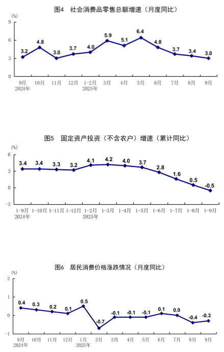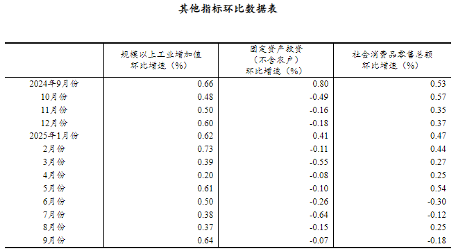 (2)根據季節(jié)調整模型自動修正結果,對近一年來各期國內生產總值、規(guī)模以上工業(yè)增加值、固定資產投資(不含農戶)、社會消費品零售總額環(huán)比增速進行修訂。修訂結果及2025年三季度GDP環(huán)比數據、2025年9月份其他指標環(huán)比數據如下: