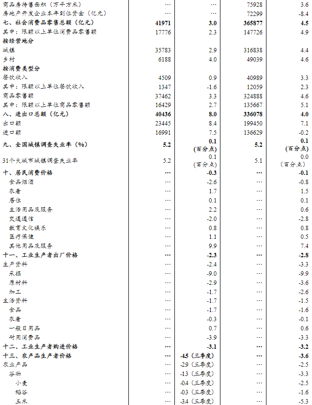 總的來看,前三季度穩(wěn)就業(yè)穩(wěn)經濟政策舉措接續(xù)發(fā)力,主要宏觀指標總體平穩(wěn),經濟運行保持穩(wěn)中有進態(tài)勢,高質量發(fā)展取得積極成效。也要看到,當前經濟運行仍面臨不少風險挑戰(zhàn),外部不穩(wěn)定不確定因素較多,國內經濟回升向好基礎仍需加力鞏固。下階段,要堅持以習近平新時代中國特色社會主義思想為指導,全面貫徹落實黨中央決策部署,堅持穩(wěn)中求進工作總基調,推動更加積極有為的宏觀政策落地增效,著力穩(wěn)就業(yè)、穩(wěn)企業(yè)、穩(wěn)市場、穩(wěn)預期,扎實推動高質量發(fā)展,促進經濟持續(xù)健康發(fā)展。