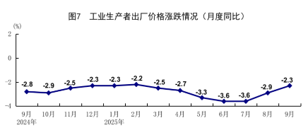 前三季度,全國工業(yè)生產者出廠價格同比下降2.8%。其中,9月份同比下降2.3%,降幅比上月收窄0.6個百分點,環(huán)比持平。前三季度,工業(yè)生產者購進價格同比下降3.2%。其中,9月份同比下降3.1%,降幅比上月收窄0.9個百分點,環(huán)比上漲0.1%。
